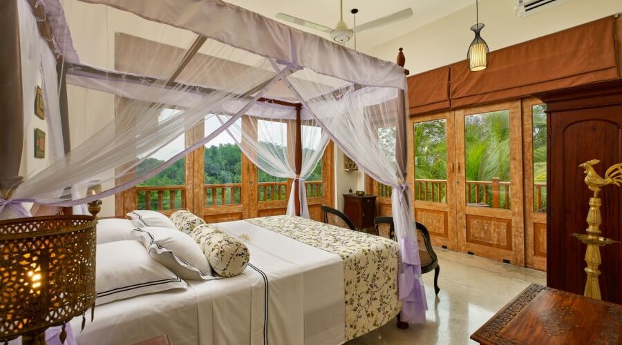 28°C Located at the front of the villa on the ground floor, this private 30 Sq meters space will charm you with its cocoon atmosphere. Its two sliding windows will allow you either to access a private balcony equipped with 2 armchairs and a table, or to enjoy the view of the garden, the forest and the swimming pool area. You will bathe in a green setting while enjoying this little nest decorated and fitted out with furniture and objects in the pure Sri Lankan spirit. The bedroom offers you the comfort of a queen size bed and a full shower area.